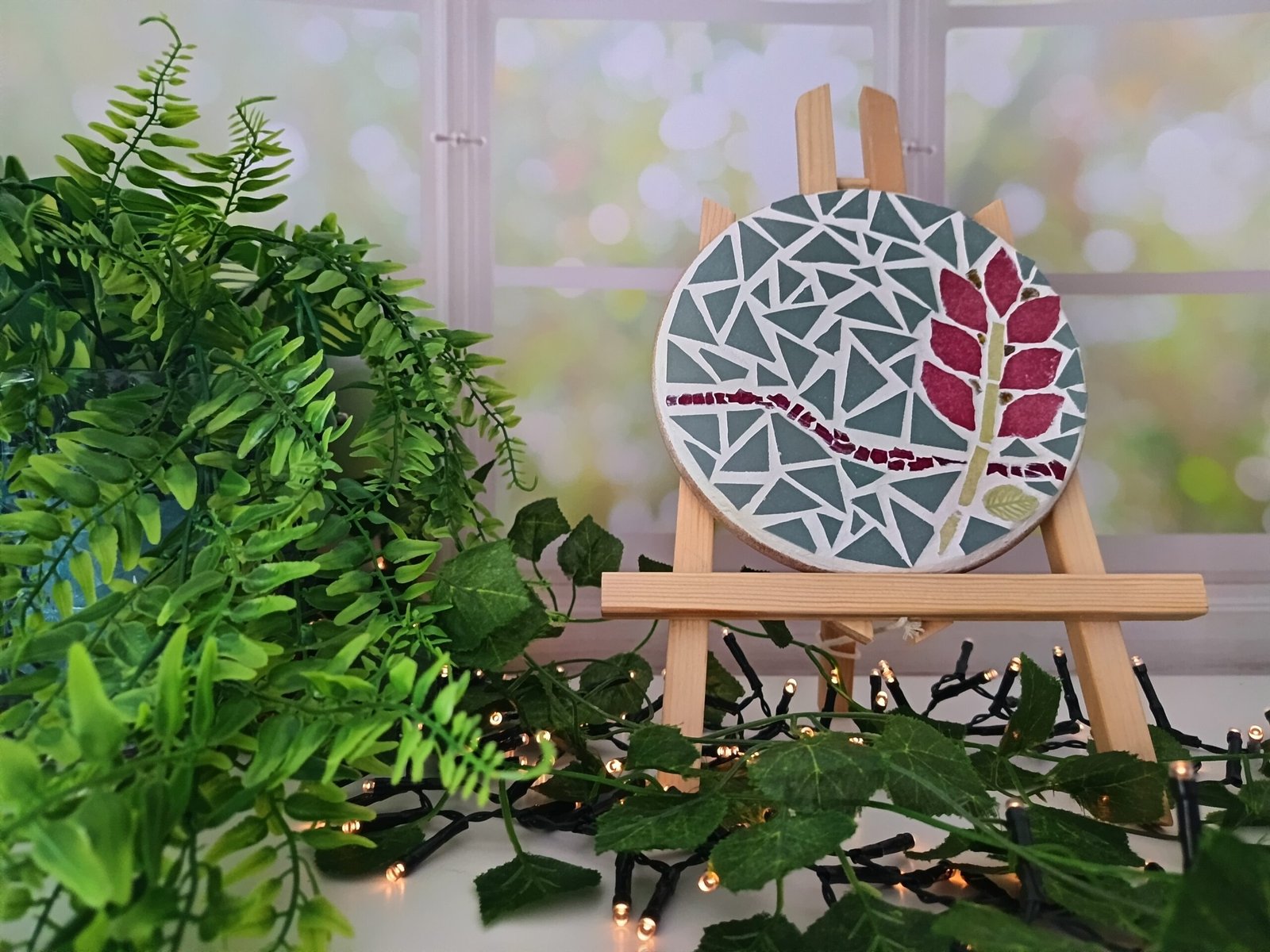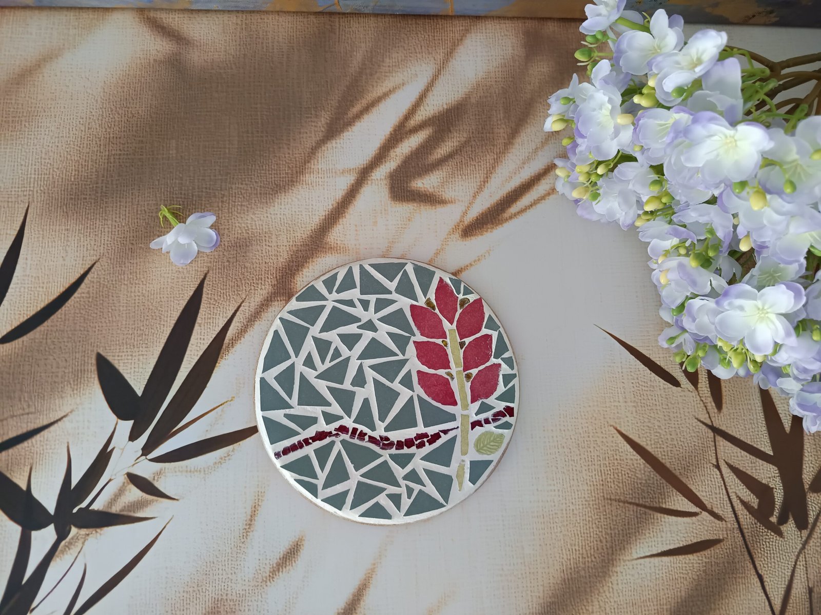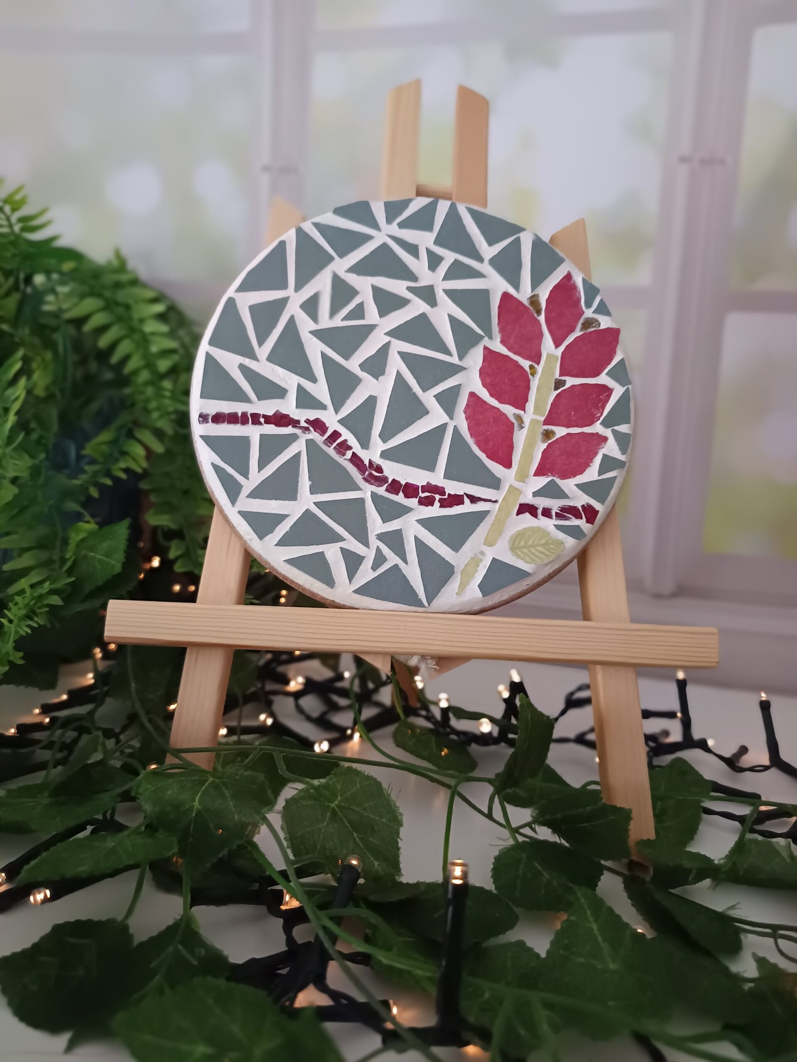 Entièrement réalisé à la main dans mon atelier en France, ce dessous de plat combine tesselles de céramique, émaux de Briare, fragments de miroir et touches de verre. Son fond vert doux rappelle les jeunes pousses, tandis que le motif floral stylisé évoque la tendresse d’un jardin en pleine éclosion.